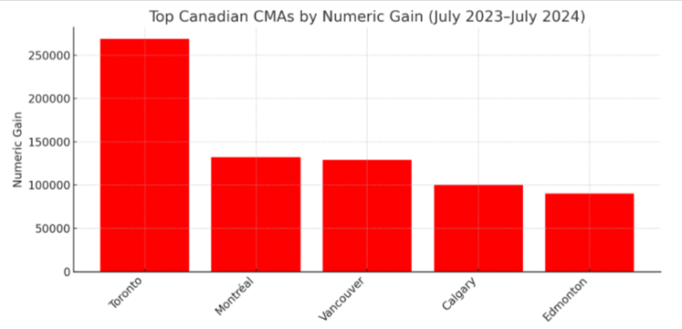 Canada’s urban population is expanding along two distinct but equally important lines: total population gain and relative growth rate. Toronto leads the country in absolute numbers, adding nearly 269,000 residents, more than any other metropolitan area. Calgary, meanwhile, recorded the fastest growth rate, with its population rising by 5.8%.