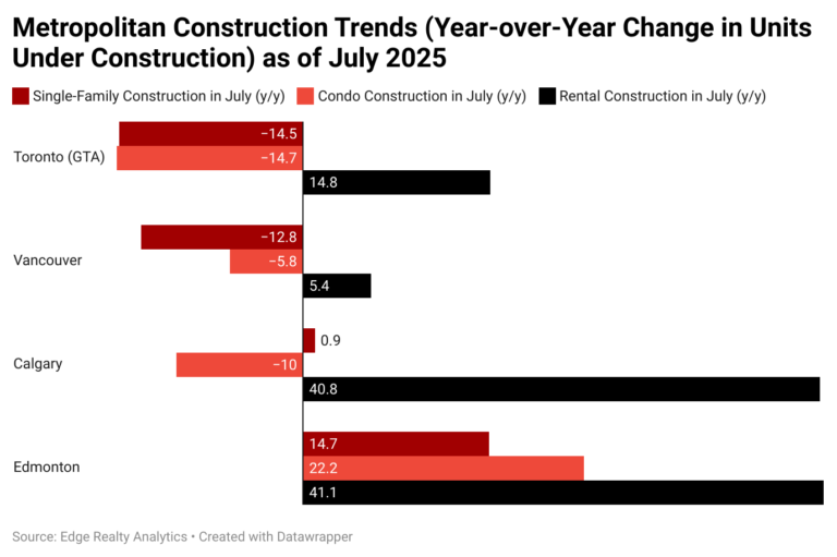 In contrast, Alberta’s markets are experiencing strong overall construction activity, but the expansion is being driven almost entirely by rentals, which have surged by more than 40% year-over-year in both Calgary and Edmonton. In Calgary, single-family activity inched up by just under 1%, while condo construction dropped by 10%. Edmonton was notable in that it saw strength across all three categories, although rentals led the expansion, with increases of 14.7% for single-family homes and 22.2% for condos.