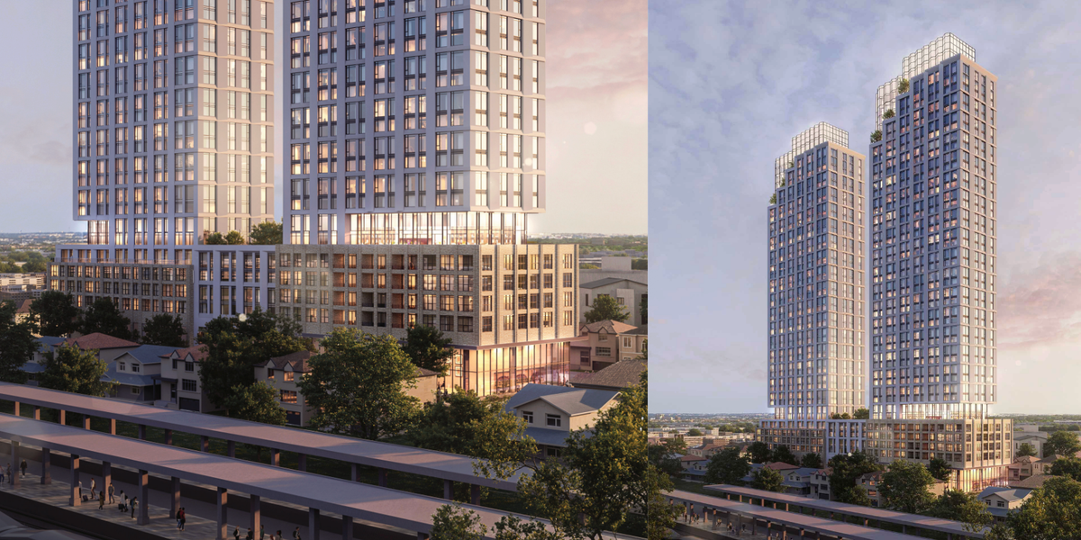 Elysium Investments has filed plans for a 43- and 41-storey residential development within walking distance of the Mount Dennis station on the forthcoming Eglinton Crosstown LRT. The plans call for two towers containing 851 rental units and a 2,152-sq.-ft Privately Owned Publicly Accessible Space (POPS) located onsite.