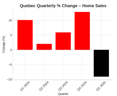 Quebec’s home sales showed a turning point over the five quarters, with a drop in the first quarter of 2025. After an initial 10.1% uptick in Q1 2024, quarterly gains slowed to 2.0% in Q2 before rebounding to 5.9% in Q3. The strongest surge came in Q4 2024, when sales jumped 12.8%, marking the period’s peak activity. This momentum reversed in Q1 2025, as sales declined 9.1% quarter-over-quarter.