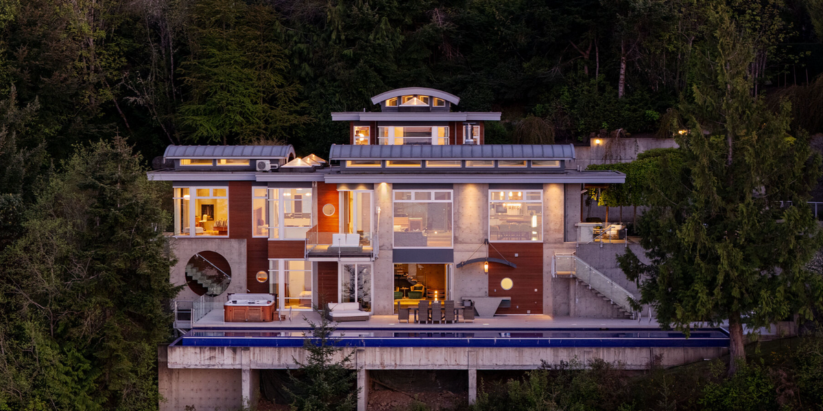 The striking steel-and-concrete residence that is 1580 Lands End Road sits on 1.59 acres of private land, boasting over 600 feet of ocean frontage and uninterrupted views that stretch from Mount Baker to the Gulf Islands. Both bold and serene, it’s a home designed to frame the drama of the Pacific while offering a peaceful retreat from the everyday.