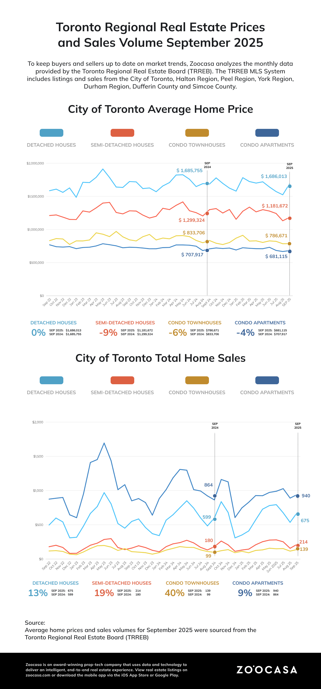 Sales activity strengthened across all major property types on a month-to-month basis. Detached home sales rose 7.3%, semi-detached sales increased 17.6%, townhouses were up 13%, condo townhouses advanced 14.7%, and condo apartments climbed 8.4%. These increases suggest improved buyer engagement as we head into the final quarter of the year.