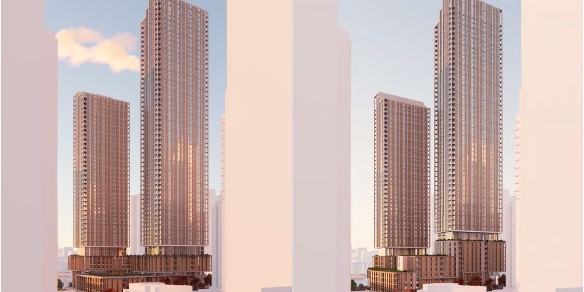View of the tower separation from the corner of Pacific and Burrard in the revised design (left) and original design (right). View of the tower separation from the corner of Pacific and Burrard in the revised design (left) and original design (right). / Diamond Schmitt Architects, Vancouver Housing Development Office