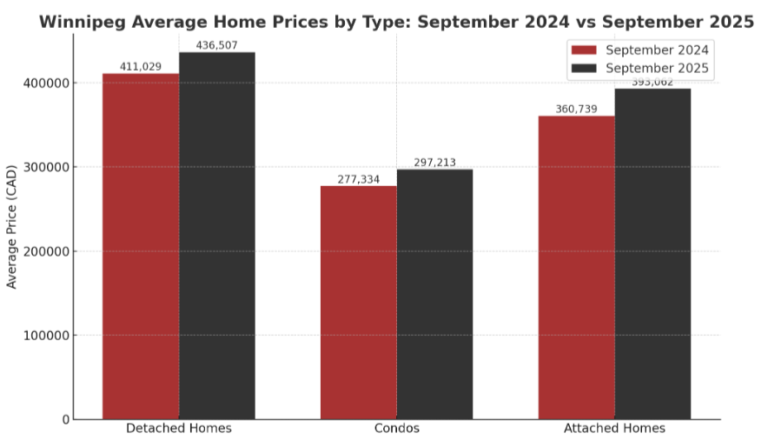 Winnipeg’s housing market saw renewed strength in September, with performance metrics rising across nearly every category. MLS® sales, dollar volume, and average prices all moved upward compared to last year and the five-year average. Both the residential detached and condominium segments achieved new record average prices for the month of September, suggesting a potential rebound in market confidence, according to the Winnipeg Regional Real Estate Board.